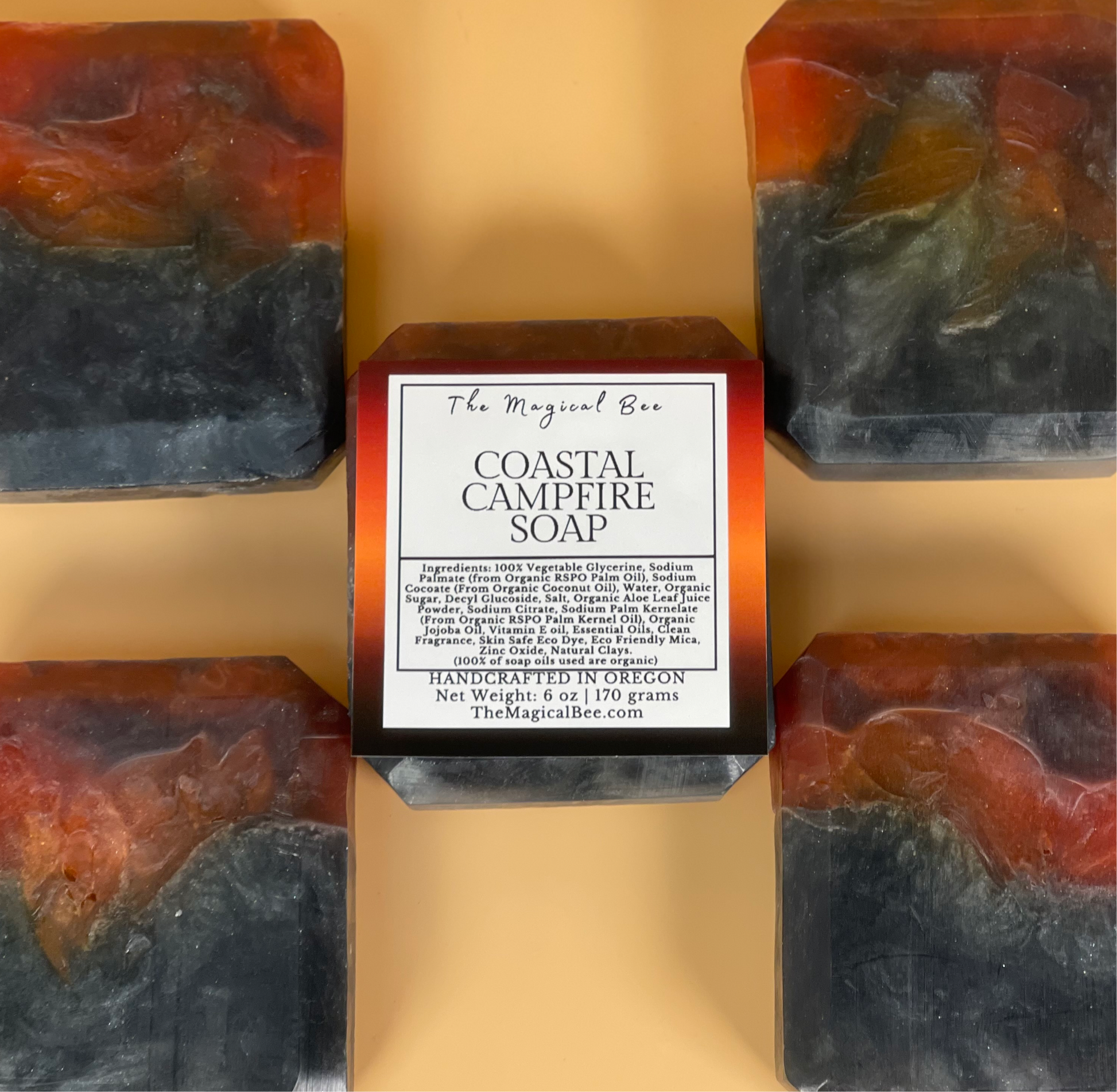 Ingredients: 100% Vegetable Glycerine, Sodium Palmate (from Organic RSPO Palm Oil), Sodium Cocoate (From Organic Coconut Oil), Water, Organic Sugar, Decyl Glucoside, Salt, Organic Aloe Leaf Juice Powder, Sodium Citrate, Sodium Palm Kernelate (From Organic RSPO Palm Kernel Oil), Organic Jojoba Oil, Vitamin E Oil, Essential Oils, Clean Fragrance, Skin Safe Eco Dye, Eco Friendly Mica, Zinc Oxide, Natural Clays. (100% of soap oils used are organic)